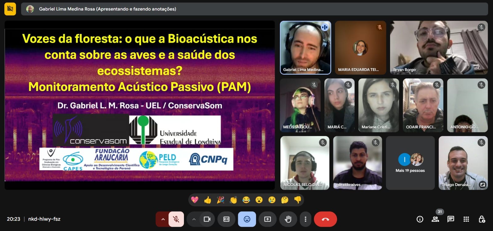 Outra palestra de grande repercussão, também ocorreu no dia 30 de maio, que abordou o tema “Vozes da Floresta: o que a Bioacústica nos conta sobre as Aves e a Saúde dos Ecossistemas”, que envolveu o assunto Bioacústica de aves, apresentada pelo professor pesquisador doutor Gabriel Rosa, da UEL (Universidade Estadual de Londrina), que explorou a diversidade de cantos de diferentes espécies de aves, assim como tais sons emitidos por estes animais, podem ser utilizados como indicadores no monitoramento da “saúde” dos ecossistemas, de forma a promover uma maior reflexão sobre a Conservação e Biodiversidade.