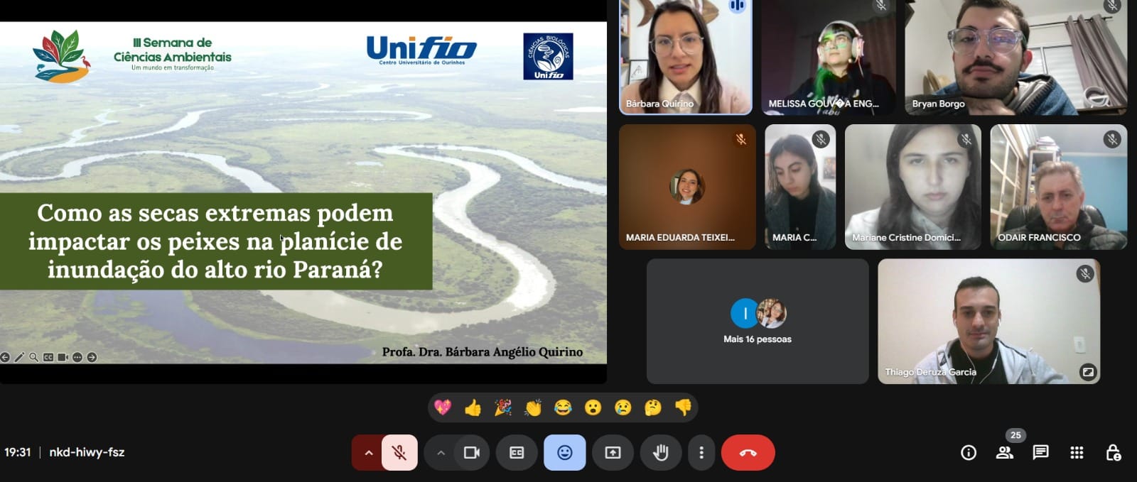 A programação de palestras em forma de transmissão ao vivo, também incluiu, no dia 30 de maio, a palestra “Como as secas extremas podem impactar os peixes da planície de inundação do Alto Rio Paraná?”, que teve como palestrante a pesquisadora doutora Bárbara Angélio Quirino, da UEM (Universidade Estadual de Maringá), que explanou sobre a ocorrência de secas extremas e os possíveis impactos multifacetados sobre os peixes da planície de inundação do Alto Rio Paraná, que por configurar-se como uma região com um ecossistema altamente dinâmico, traz dependência em conformidade ao pulso de inundação, que comporta o ciclo natural de cheias e secas e que tem por fim, manter uma maior biodiversidade neste ambiente.