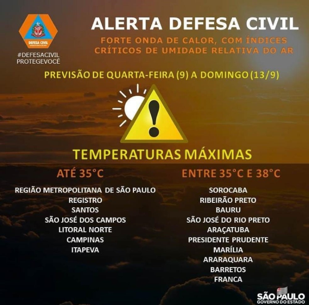 A Defesa Civil emitiu um alerta para uma onda de calor que pode causar temperaturas de até 38ºC nos próximos dias em cidades do interior de São Paulo. Em Ourinhos o Clima tempo aponta calor intenso, com máximas que podem ultrapassar os 35°C neste sábado, 12 e domingo, 13.