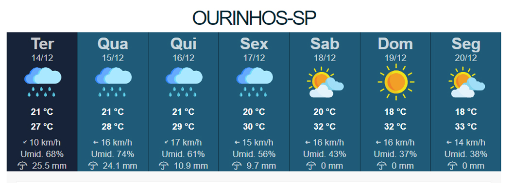 De acordo com o órgão, São José do Rio Preto, Sorocaba, Bauru e Marília (SP) podem registrar, entre os dias 14 e 17 de dezembro, precipitação de até 90 milímetros.