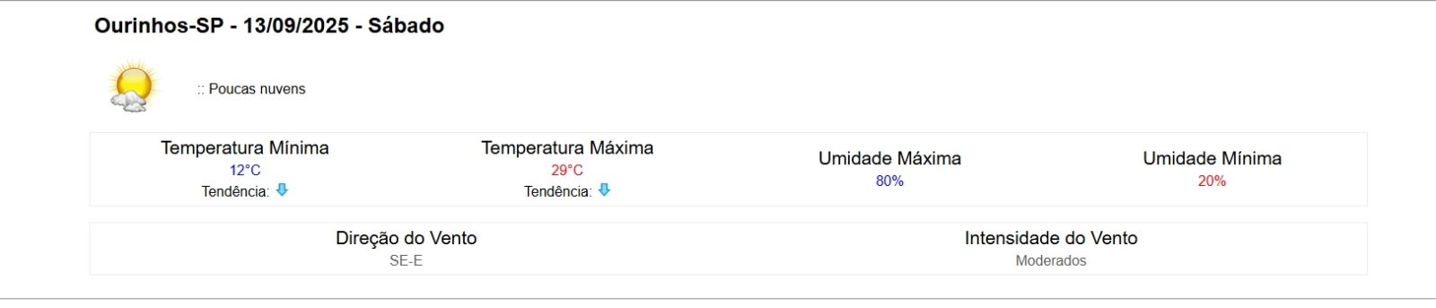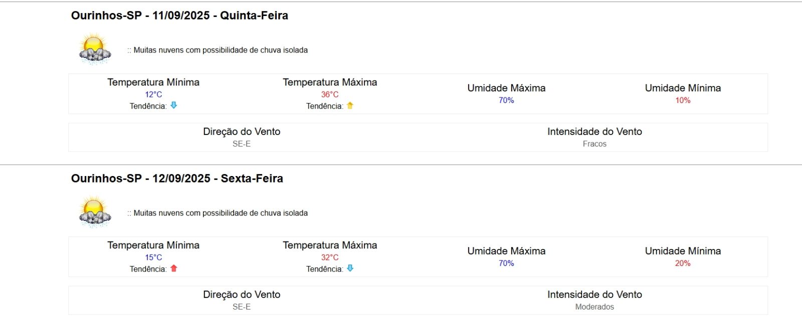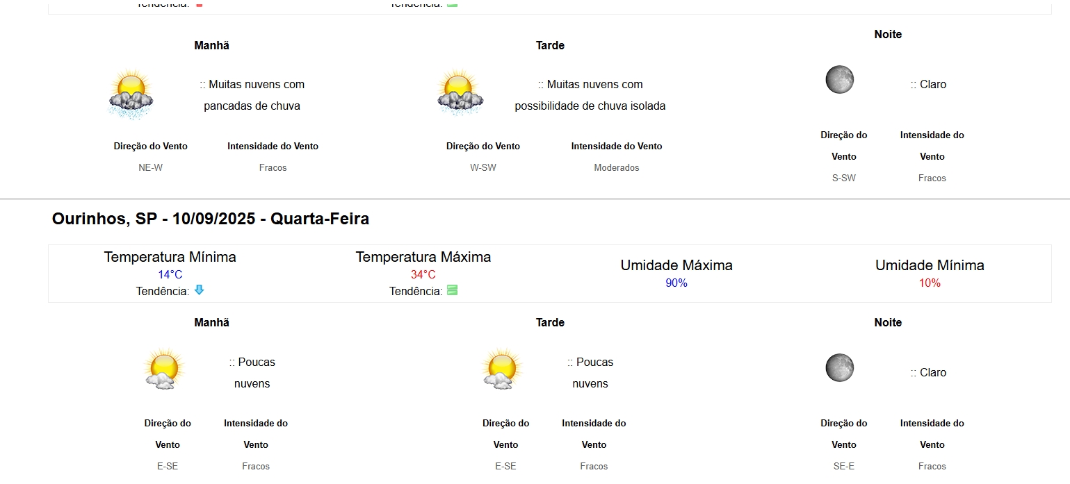 Em Ourinhos, já choveu pela manhã e ainda podem ocorrer pancadas isoladas ao longo do dia. Apesar da quantidade de chuva ser pequena, foi suficiente para elevar a umidade relativa do ar, que ontem chegou a apenas 28% e nesta terça subiu para 91%. A previsão aponta que não deve chover amanhã (10), mas há possibilidade de novas precipitações na quinta (11) e sexta-feira (12).