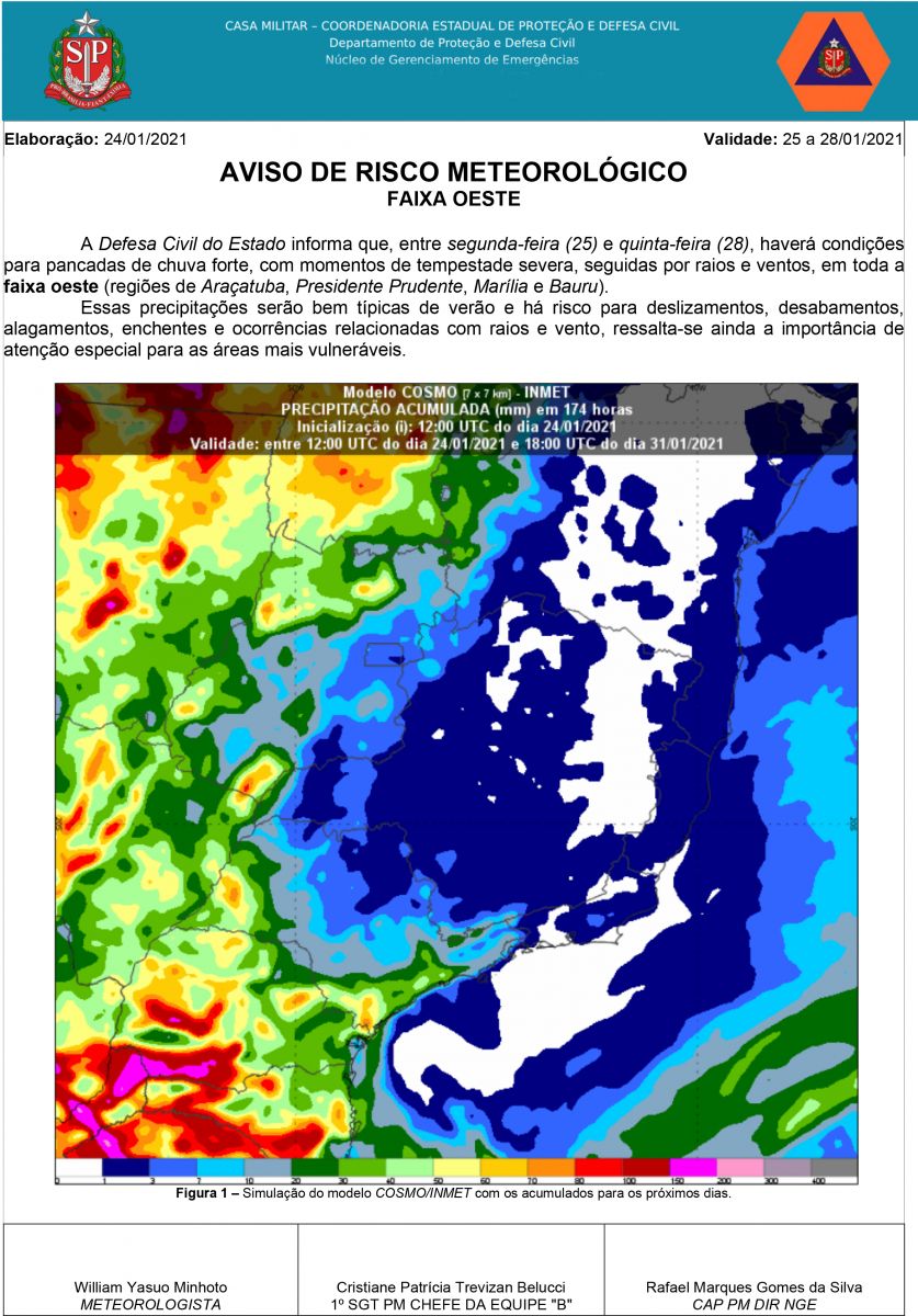 Essas precipitações serão bem típicas de verão e há risco para deslizamentos, desabamentos, alagamentos, enchentes e ocorrências relacionadas com raios e vento, ressalta-se ainda a importância de atenção especial para as áreas mais vulneráveis.