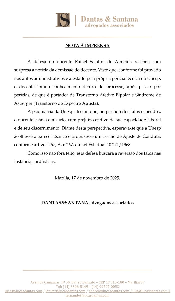 A defesa de Rafael Salatini de Almeida, professor do Departamento de Ciências Políticas e Econômicas da Unesp de Marília (SP), contestou a demissão por justa causa do docente, oficializada no último dia 12 de novembro. Segundo os advogados, o professor estava em "surto psiquiátrico" no período em que ocorreram as 44 denúncias de assédio.