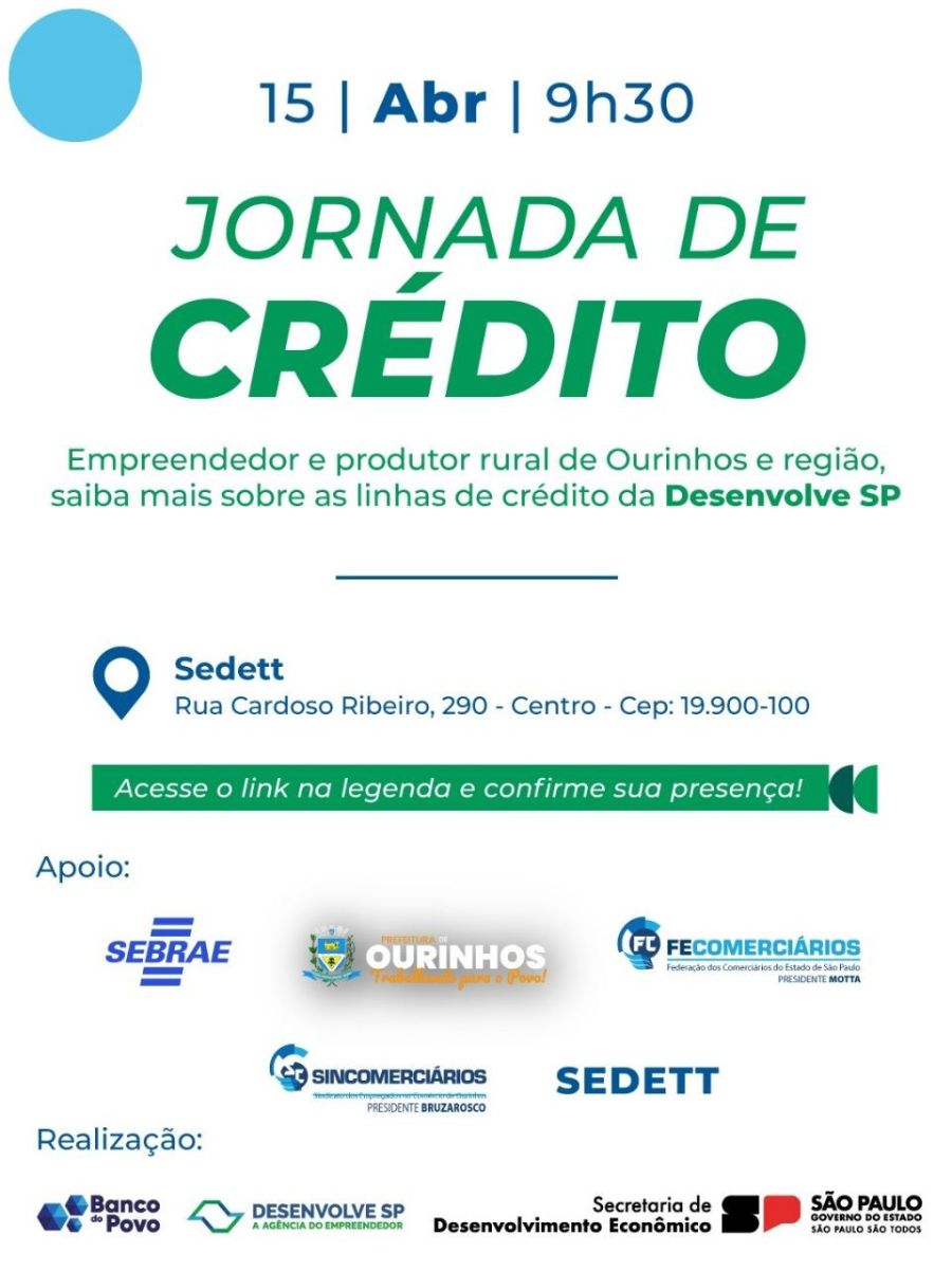 A cidade de Ourinhos recebe em 15 de abril, esta quarta-feira, a Jornada de Crédito, promovida pela Desenvolve SP. O evento será realizado às 9h30, no Sebrae, com orientação especializada dos consultores da agência de fomento do Estado de São Paulo a empresários e produtores rurais interessados em investir em seus negócios.