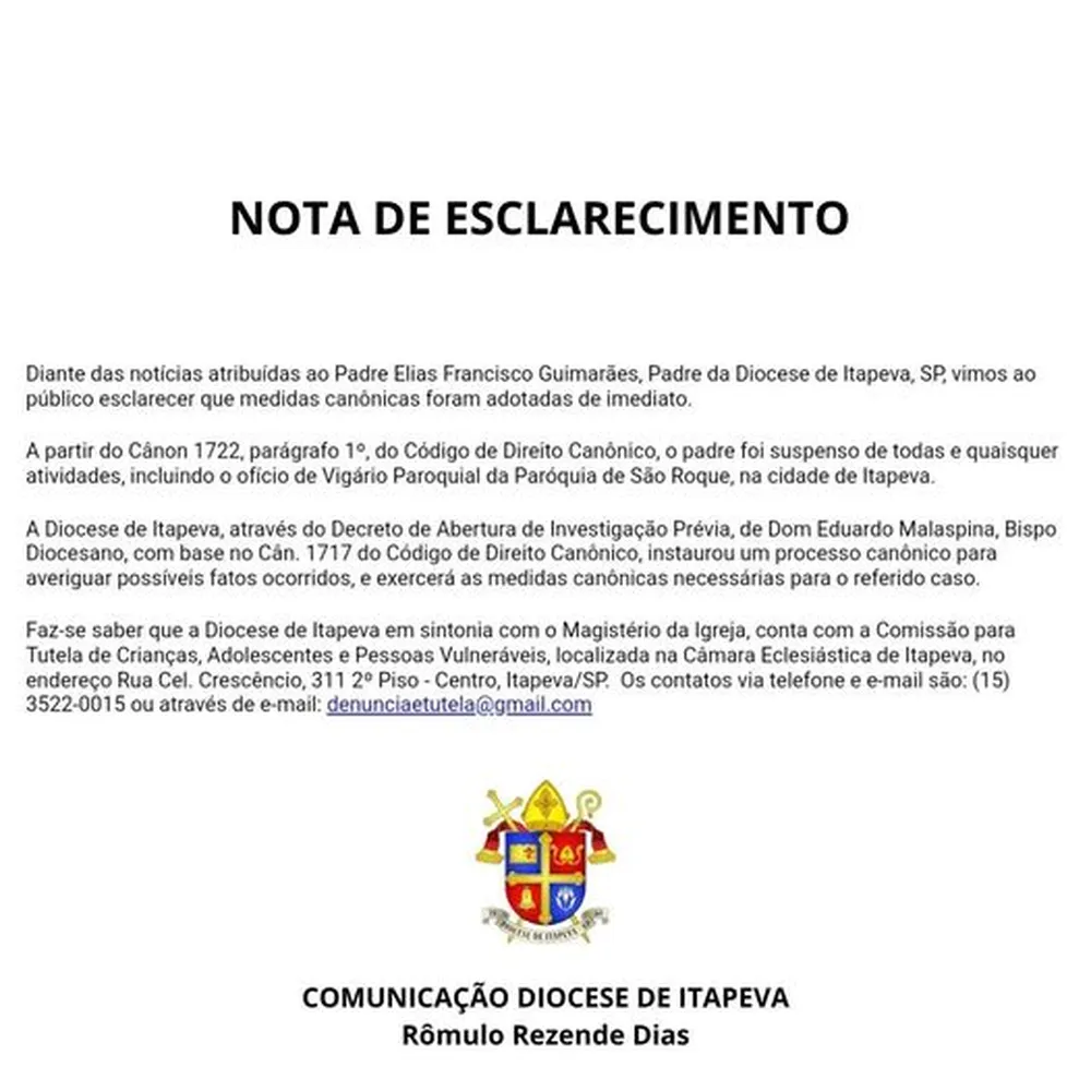 O afastamento do padre Elias Francisco Guimarães, de 63 anos, foi anunciado no último sábado, 17, por meio das redes sociais da diocese. Ele atuava na Paróquia São Roque há aproximadamente seis meses.