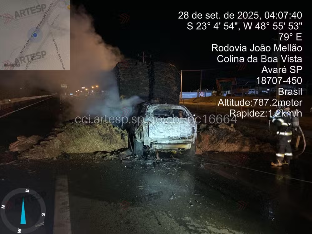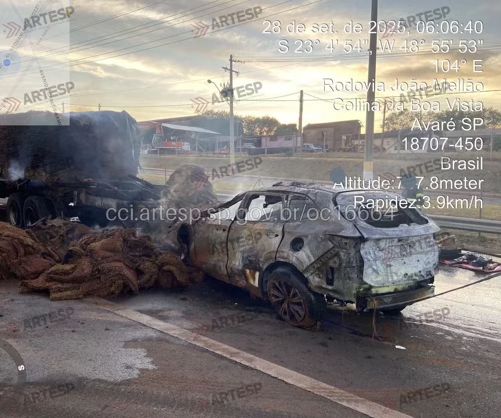 Carro pega fogo após bater na traseira de caminhão em rodovia de Avaré (SP) — Foto: Reprodução/Artesp