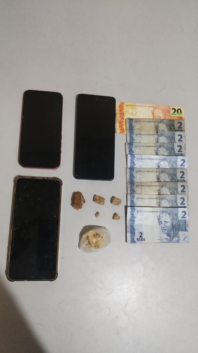 Durante a busca pessoal, com V. foi localizado um aparelho celular Samsung, a quantia de R$ 36,00 e uma embalagem plástica contendo porção de substância semelhante a crack. Já com A., os policiais encontraram outra embalagem com uma pedra bruta da mesma substância, além de um celular Motorola.