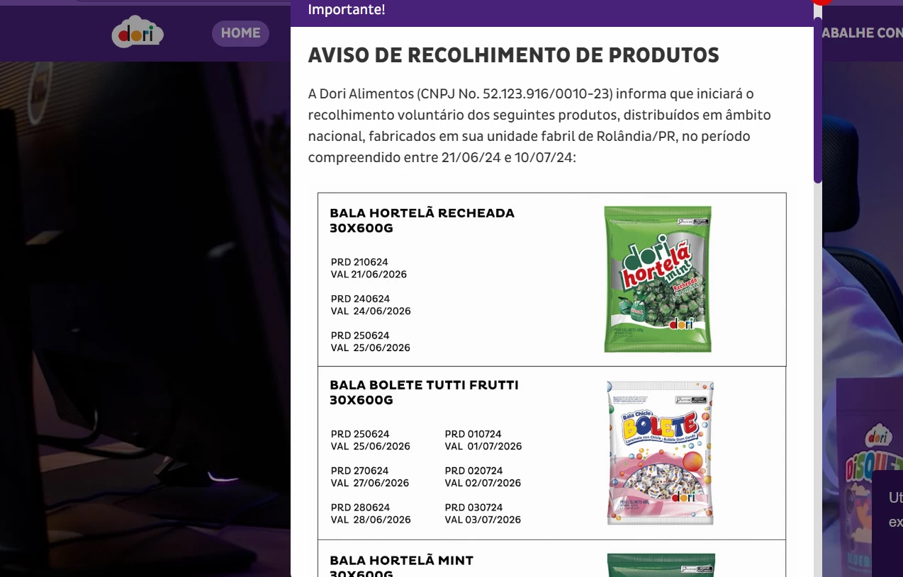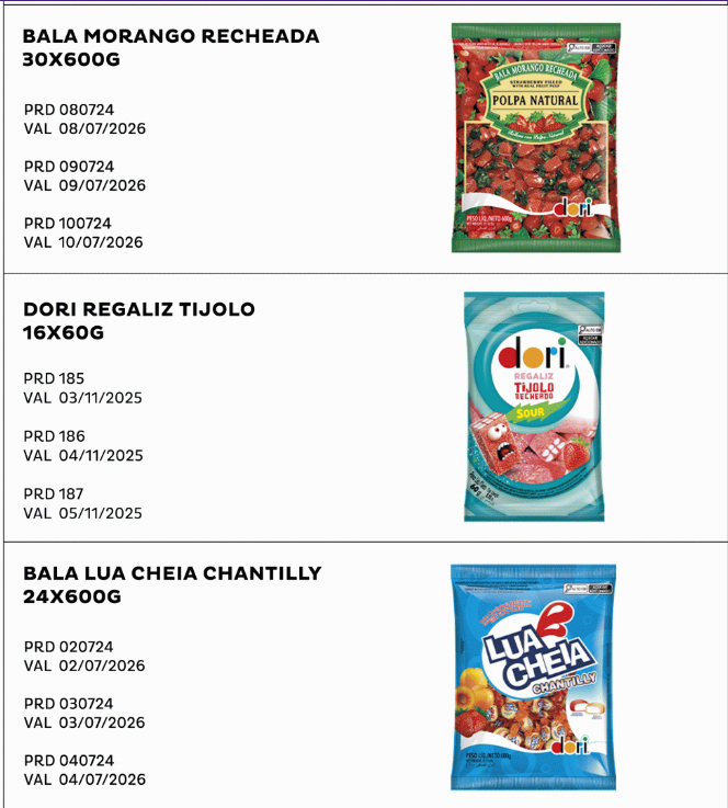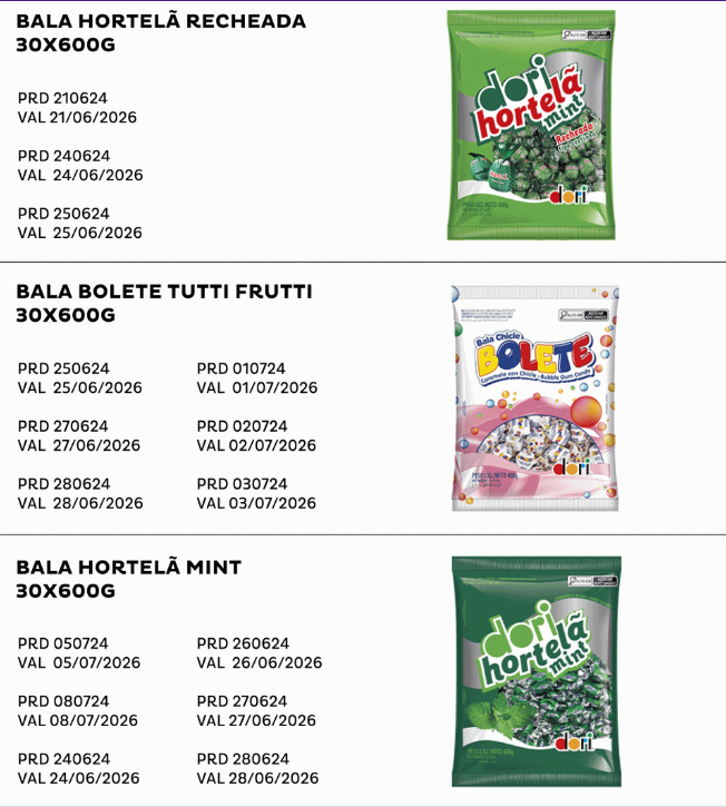 A Dori Alimentos anunciou nesta quinta-feira, 22 de agosto, o recolhimento voluntário de diversos lotes de balas fabricados em sua unidade de Rolândia, no Paraná, devido ao risco de contaminação por Salmonella Muenchen, uma bactéria que pode causar infecção gastrointestinal grave. Os produtos afetados foram produzidos entre 21 de junho e 10 de julho deste ano e incluem balas de diversos sabores, como Hortelã Recheada, Bolete Tutti Frutti, e outras. O anúncio foi feito pelo site: https://dori.com.br/