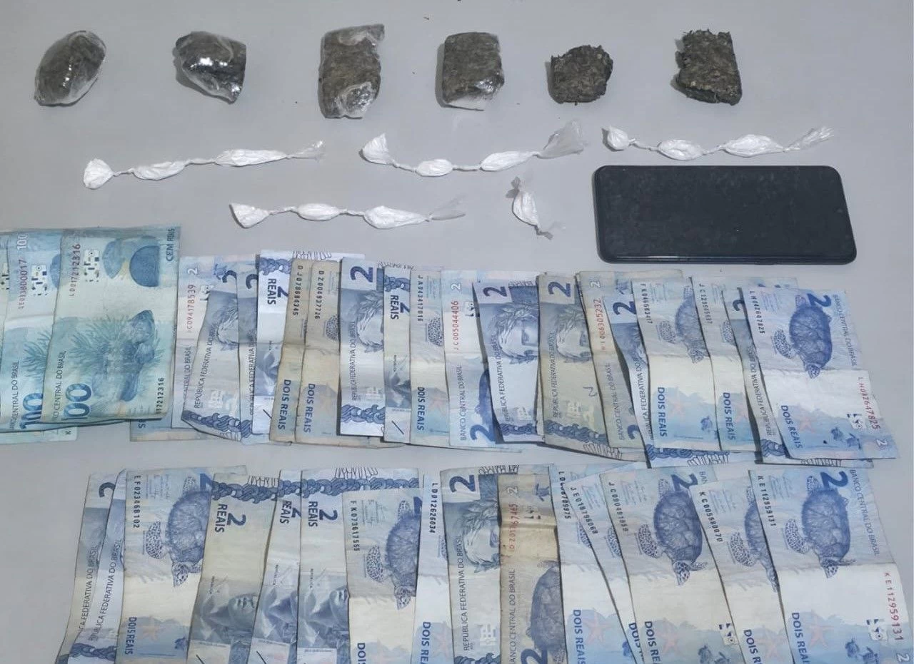 No imóvel alvo da denúncia, os policiais localizaram a segunda envolvida, identificada como T. de 21 anos. Ela admitiu a existência de drogas na casa e indicou onde os entorpecentes estavam guardados, também autorizando a busca, registrada por meio audiovisual. Em uma caixa sobre a mesa da sala, foram apreendidos seis tabletes de maconha, 13 papelotes de cocaína, um aparelho celular e R$ 372 em dinheiro, acondicionados de maneira semelhante ao material encontrado com I.