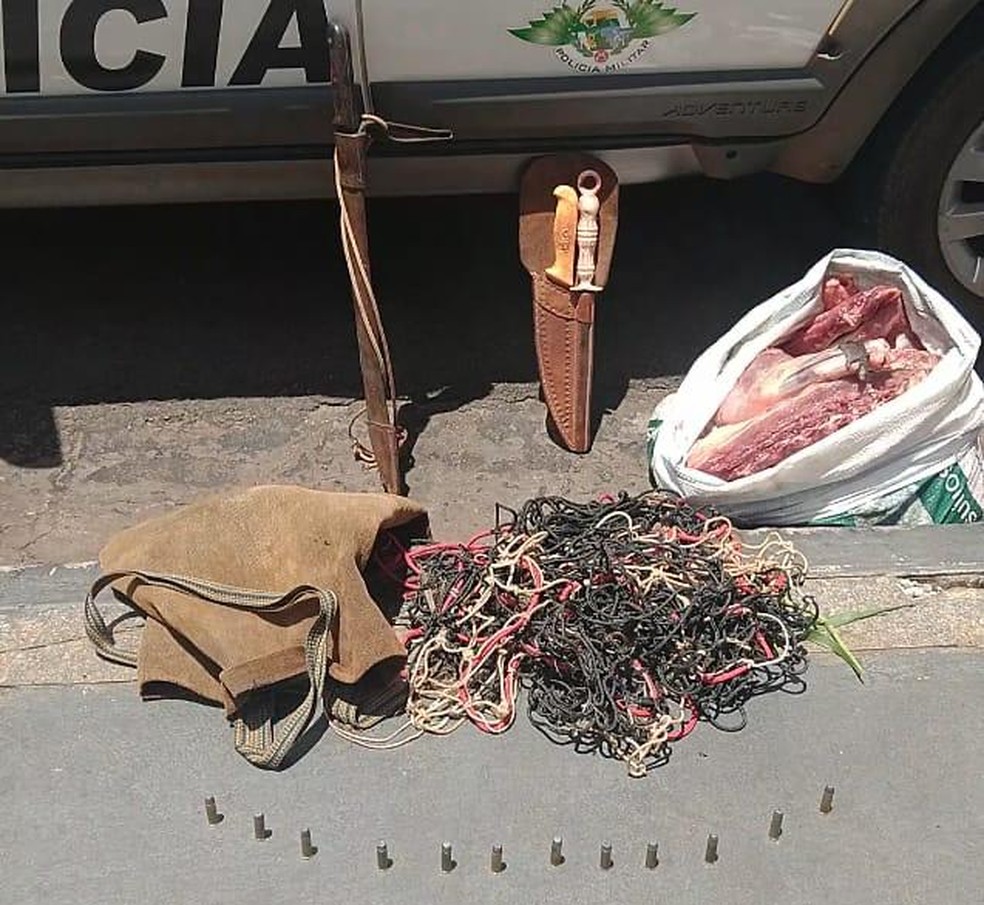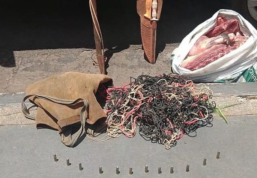 Durante o patrulhamento, os policiais ouviram os dois suspeitos conversaram e entraram na mata, onde fizeram a abordagem. Com os homens, foram encontrados uma carabina calibre 38, 12 cartuchos, uma faca, um facão e um amolador.