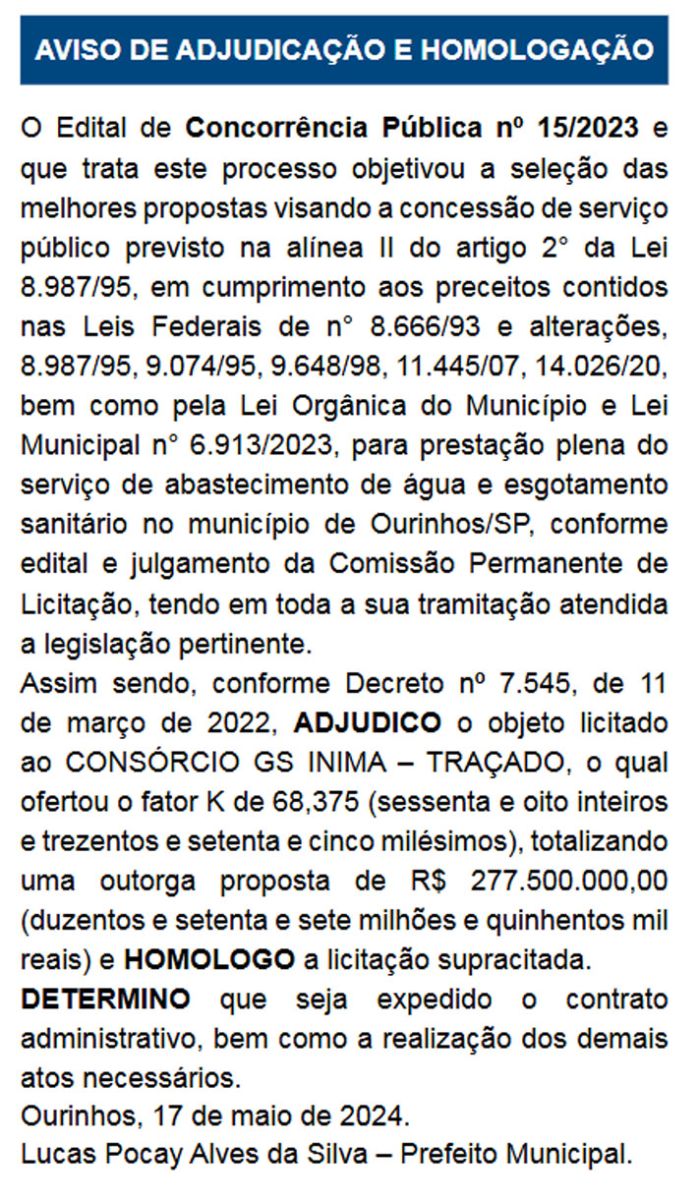 Na última sexta-feira, 17, foi publicada no Diário Oficial do Município a homologação do Edital de Concorrência Pública nº 15/2023, que trata da prestação plena do serviço de abastecimento de água e esgotamento sanitário em Ourinhos (SP). O consórcio GS INIMA – TRAÇADO foi declarado vencedor, tendo oferecido, no dia 3 de abril, o fator K de 68,375, resultando em uma outorga proposta de R$ 277.500.000,00. Veja o vídeo abaixo.