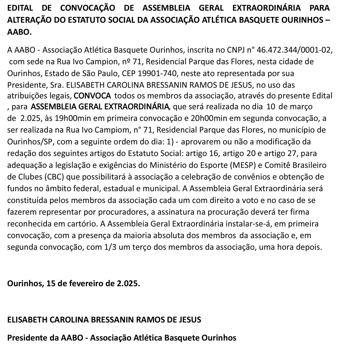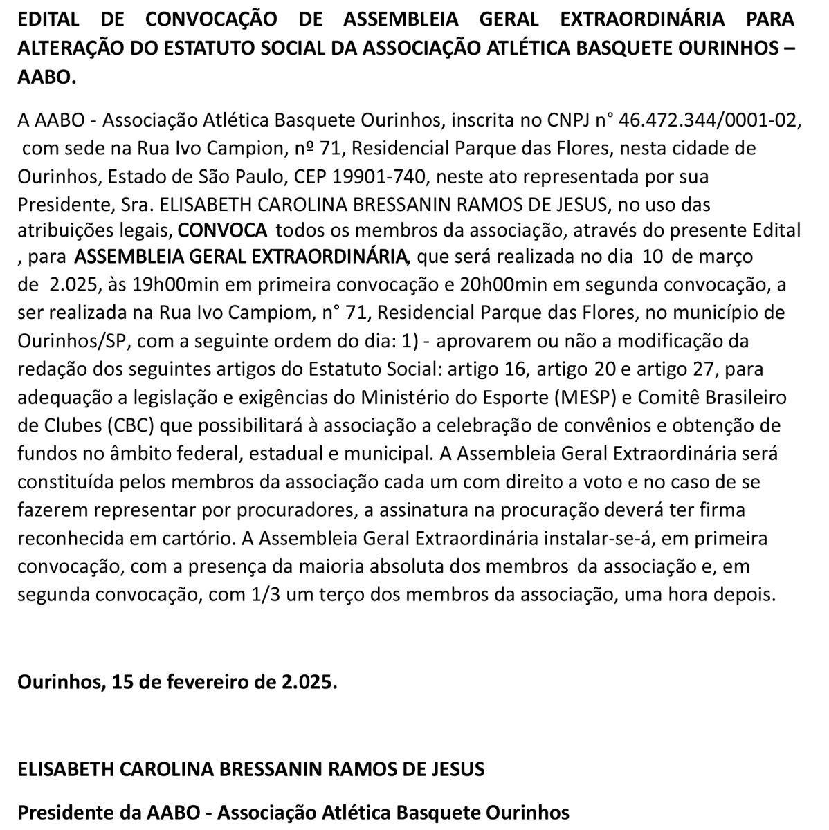 EDITAL DE CONVOCAÇÃO DE ASSEMBLEIA GERAL EXTRAORDINÁRIA PARA ALTERAÇÃO DO ESTATUTO SOCIAL DA ASSOCIAÇÃO ATLÉTICA BASQUETE OURINHOS – AABO.