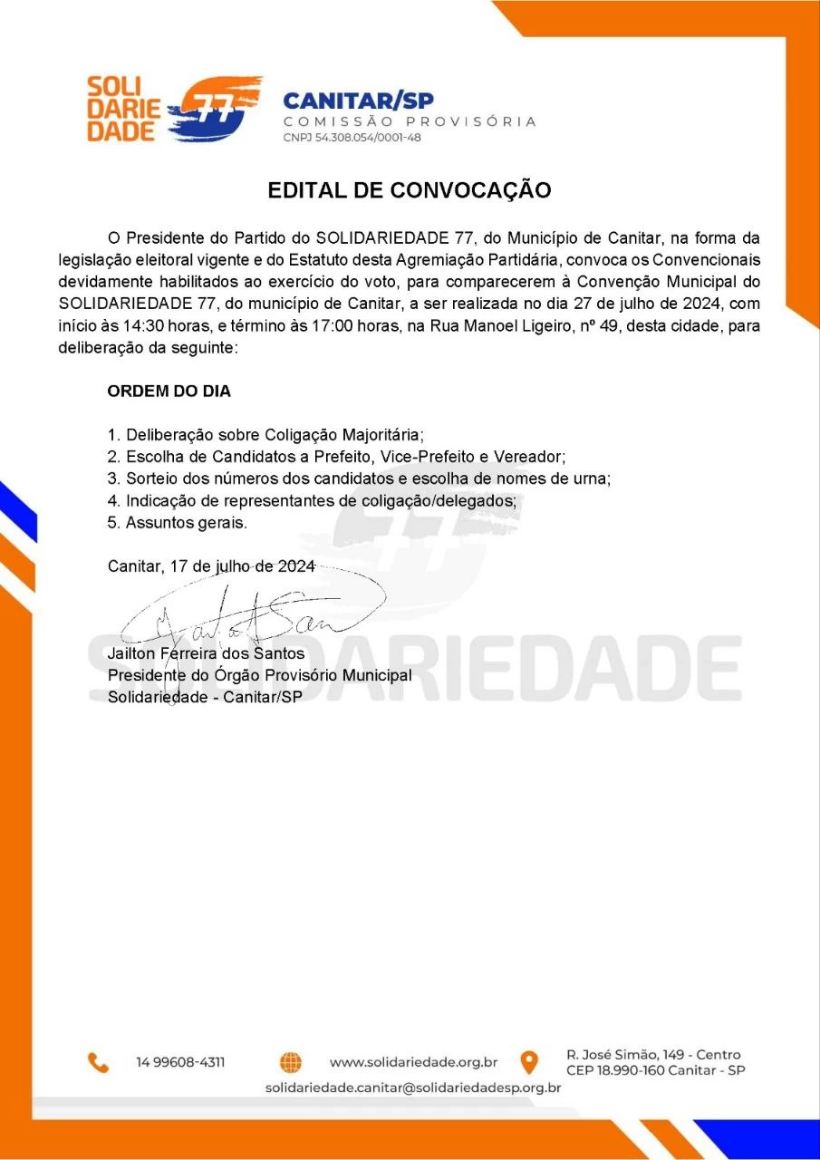 Edital de Convocação para Convenção Municipal do Partido Solidariedade em Canitar