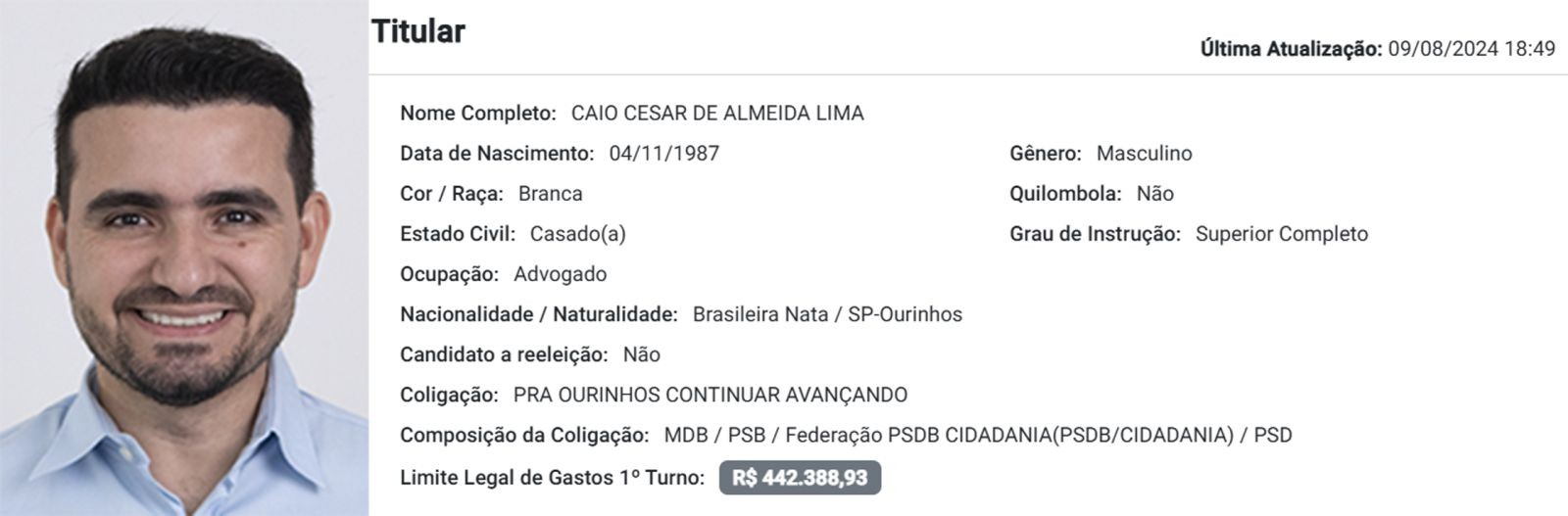 Caio Lima é candidato pelo Partido Social Democrático. Foi vereador por quatro anos, atuou como secretário municipal, mas é advogado e um dos sócios de uma empresa familiar (Uniclan). Ele declarou um patrimônio total de R$ 449.947,05. Com R$ 125.000,00 de quotas ou quinhões de capital; R$68.900,00 dinheiro em espécie; R$ 58,84 caderneta de poupança; R$ 9.412,20; Aplicação de renda fixa (CDB, RDB e outros); R$ 6.000,00 em motos; R$ 205.640,53 em uma casa; R$33.263,00 em um automóvel; R$ 1.672,48 em depósito bancário.