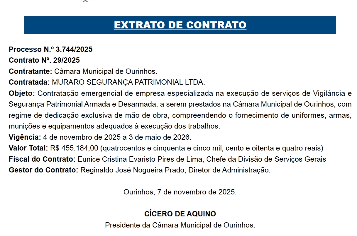 A Câmara Municipal de Ourinhos publicou nesta sexta-feira, 7, um contrato emergencial para a contratação de uma nova empresa de vigilância e segurança patrimonial armada e desarmada. O acordo foi assinado com a empresa Muraro Segurança Patrimonial Ltda., com vigência de 4 de novembro de 2025 a 3 de maio de 2026, e valor total de R$ 455.184,00, equivalente a R$ 75.864,00 mensais.