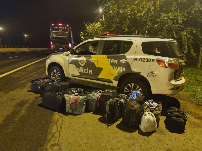 "Durante Operação Paz e Proteção, a equipe do Policiamento Rodoviário de Ourinhos abordou o M.Benz/Comil (ônibus), e durante a vistoria, localizou no bagageiro do veículo 07 malas com produtos oriundos do Paraguai e desprovidos de documentação fiscal. Indivíduos presos em flagrante.