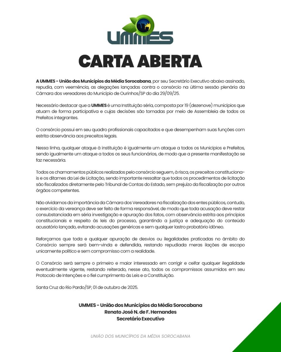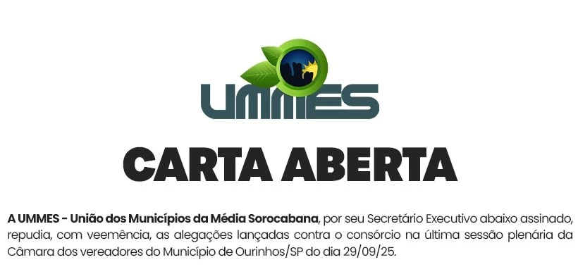 Em meio a uma série de acusações levantadas na Câmara Municipal de Ourinhos, a UMMES (União dos Municípios da Média Sorocabana) divulgou, nesta quarta-feira (1º), uma carta aberta à população para rebater os ataques. As críticas, proferidas principalmente pelo vereador Ederson Kita (MDB), apontavam supostas irregularidades em contratos e licitações do consórcio.