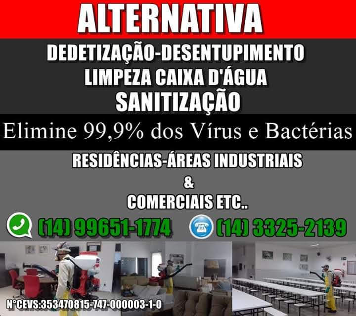 A empresa ourinhense, Alternativa, é referência regional em dedetização, com serviços de desentupimento, limpeza de caixa d’água e sanitização de ambientes. Confira o vídeo abaixo
