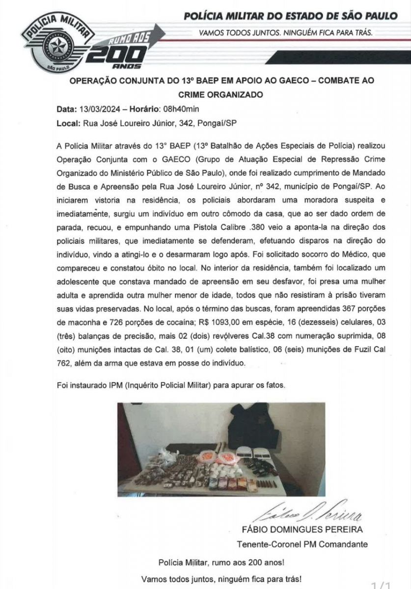 Um homem morreu baleado pela Polícia Militar, na manhã desta quarta-feira (13), em Pongaí (SP). O caso aconteceu durante uma operação de combate ao crime organizado, realizada pelo Batalhão de Ações Especiais de Polícia (Baep), em parceria com o Grupo de Atuação Especial de Repressão ao Crime Organizado (Gaeco), do Ministério Público.