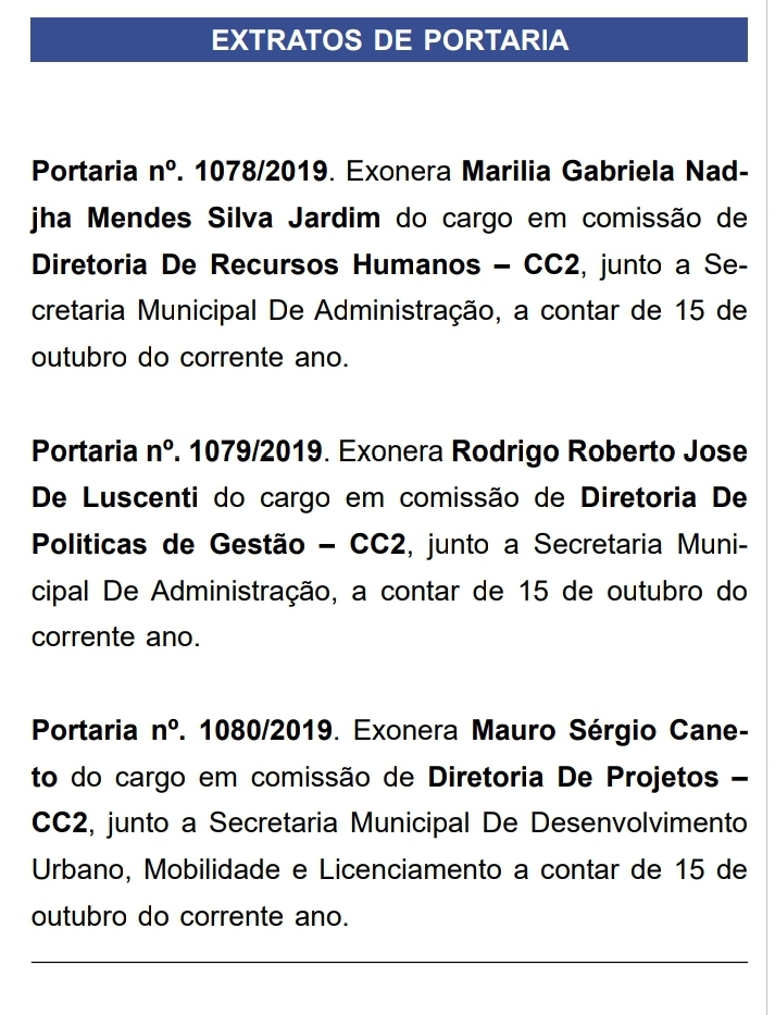 - No dia seguinte ao escândalo, três portarias de exonerações de cargos comissionados foram publicadas no Diário Oficial do Município (veja a imagem a cima). Porém ficou descoberto que apenas dois servidores estariam suspostamente envolvidos com os empréstimos irregulares e o terceiro na verdade se tratava de um cargo supostamente “fantasma”, nomeado na Secretaria de Desenvolvimento Urbano, Mobilidade e Licenciamento.
