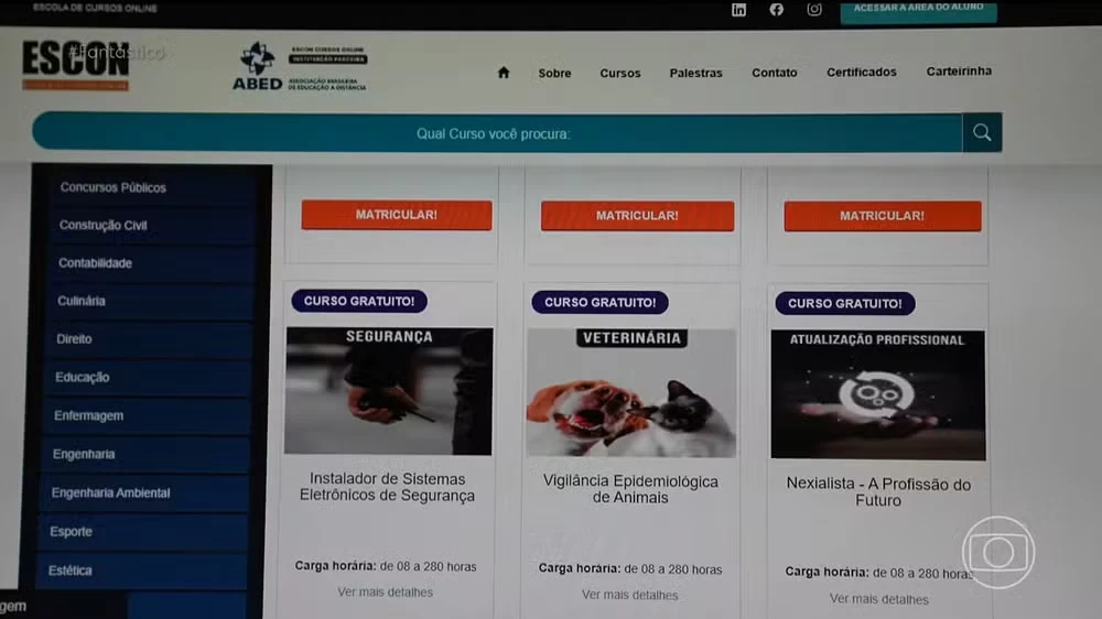 Uma operação do Ministério Público revelou um esquema de venda de diplomas e carteirinhas de estudante falsas em todo o Brasil, resultando na prisão de quatro pessoas. As instituições de ensino Escon e Fajon ofereciam cursos online que deveriam ter centenas de horas, mas que podiam ser concluídos em minutos. O caso veio à tona após uma prefeitura em Goiás identificar um número anormal de certificados apresentados por servidores. As informações foram divulgadas em matéria do programa Fantástico da Rede Globo.