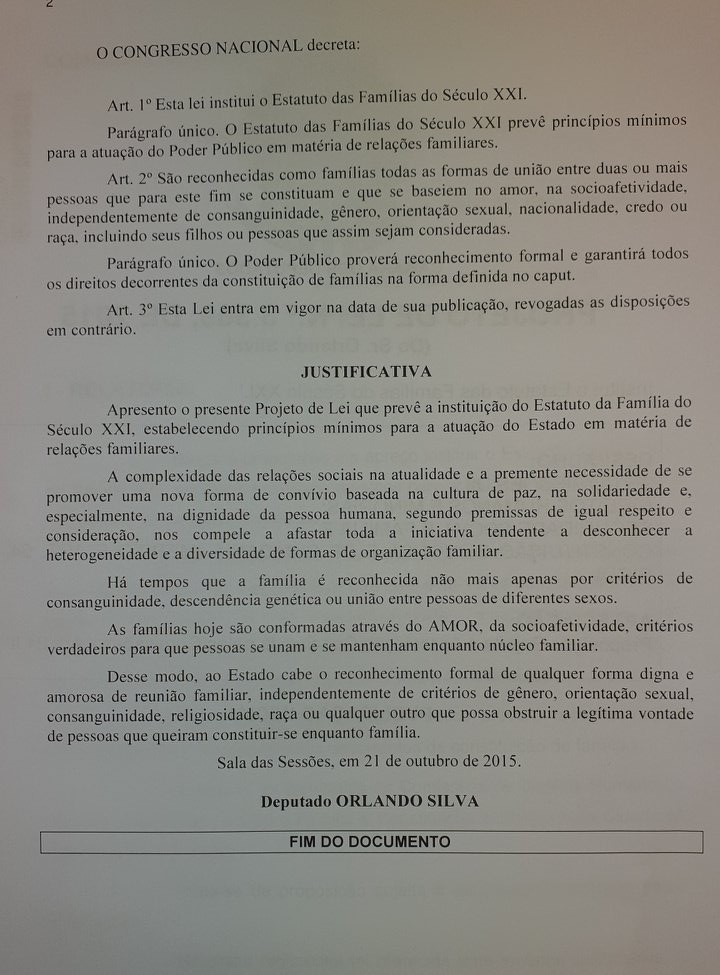Apresentada pelo deputado Orlando Silva (PCdoB-SP), a proposta define como famílias: "Todas as formas de união entre duas ou mais pessoas que para este fim se constituam e que se baseiem no amor, na socioafetividade, independentemente de consanguinidade, gênero, orientação sexual, nacionalidade, credo ou raça, incluindo seus filhos ou pessoas que assim sejam consideradas."