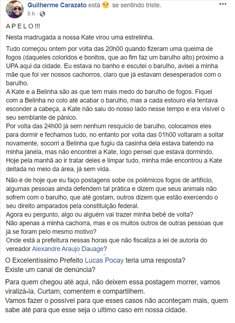 “Não é de hoje que eu faço postagens sobe os polêmicos fogos de artifício, algumas pessoas ainda defendem tal prática e dizem que seus animais não sofrem com o barulho, que até gostam, outros dizem que estão exercendo o seu direito amparados pela constituição federal.