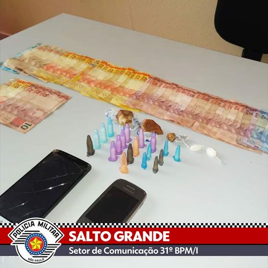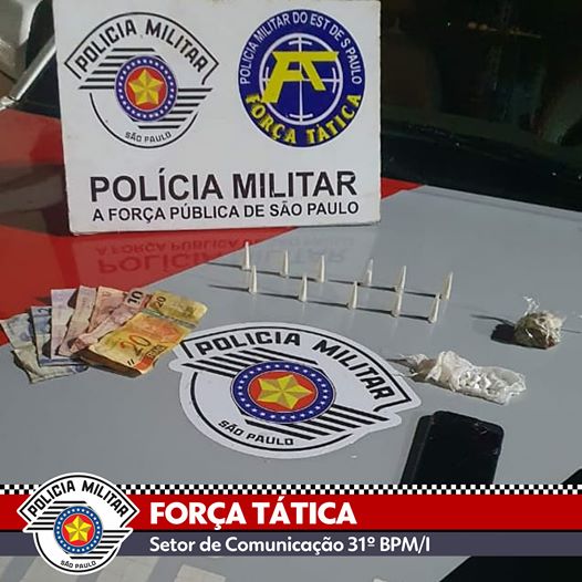 Ontem (16/08) a equipe de Força Tática, durante o patrulhamento preventivo em local de interesse em segurança pública, visualizaram uma movimentação entre dois homens sendo que um deles estava em um veículo e outro já conhecido nos meios policiais estava a pé, ao perceber presença da viatura policial, jogou algo no chão e correu para dentro da residência, os policiais foram atrás e ao realizar a abordagem localizaram 01 aparelho celular IPhone e R$ 54,00 em notas diversas, divididos em vários bolsos, ao verificar o que havia dispensado, era 01 eppendorf de cocaína. Com o apoio do Canil-K-9 do 13º Baep, localizaram 10 eppendorfs contendo cocaína,1 tablete de maconha e 01 invólucro plástico contendo 05 (cinco) pedras brutas de cocaína. Diante da materialidade, o criminoso foi encaminhado a Cadeia Pública de São Pedro do Turvo/SP.