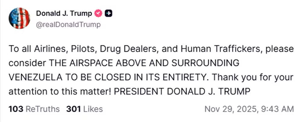 O presidente dos Estados Unidos, Donald J. Trump, declarou neste sábado (29) que o espaço aéreo “acima e ao redor da Venezuela” deve ser considerado “totalmente fechado” por companhias aéreas, pilotos, narcotraficantes e traficantes humanos. A mensagem foi publicada em sua rede social, com um tom direto: