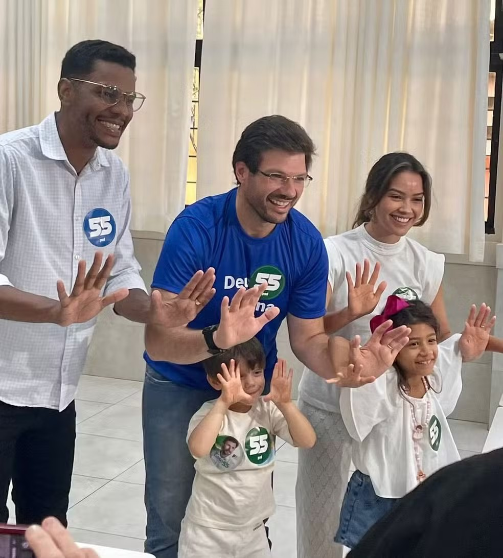 Tiago Amaral (PSD) votou acompanhado da família e do vice, Junior Santos Rosa (PSD) — Foto: Reprodução/RPC