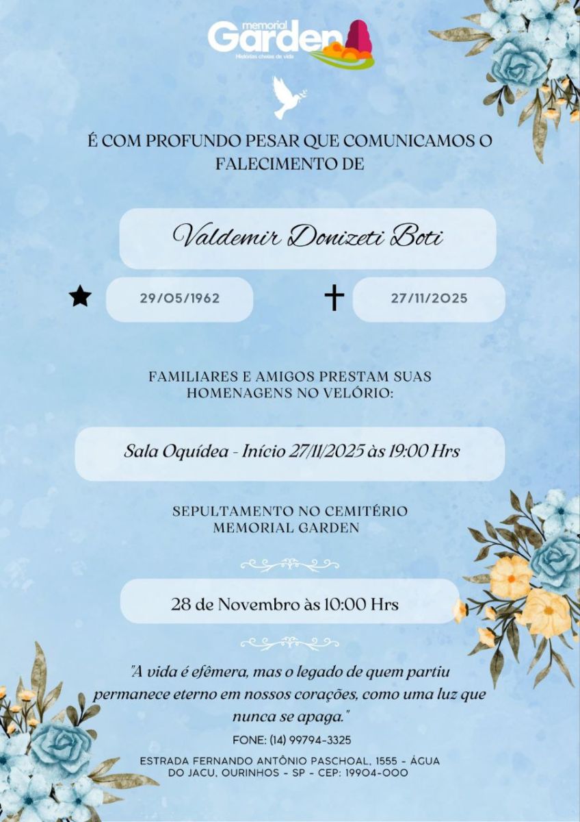 O velório terá início às 19h desta quinta-feira, no Memorial Garden. O sepultamento está marcado para amanhã, 28, às 10h, no Cemitério Parque Memorial Garden de Ourinhos.