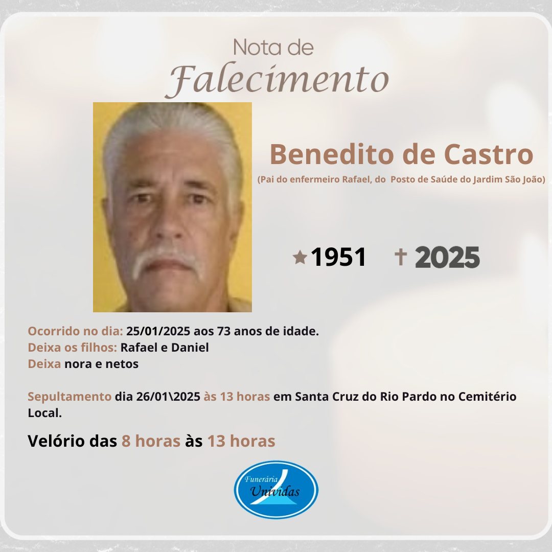 Benedito de Castro, de 73 anos, faleceu em Santa Cruz do Rio Pardo. Seu velório acontece no Velório Municipal, e o sepultamento está marcado para hoje (26), às 13h, no Cemitério Municipal da cidade.