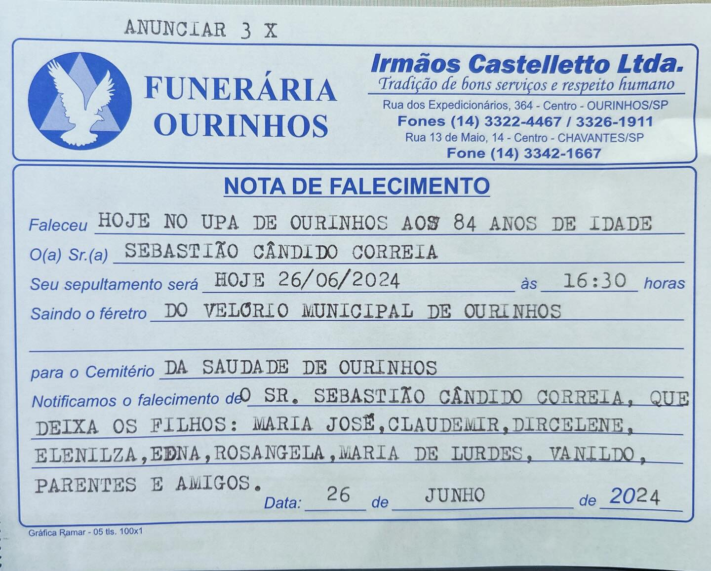 Falecimento em Ourinhos