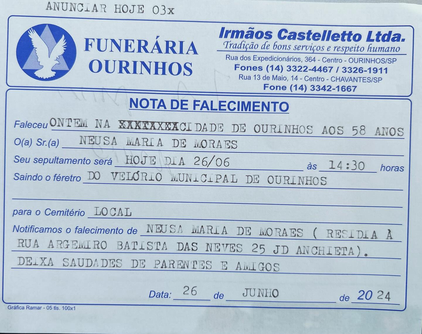 A Funerária Ourinhos informa: Na manhã desta quarta-feira, 26 de junho, a cidade de Ourinhos se despede da senhora Neusa Maria de Moraes, que faleceu aos 58 anos. O velório será realizado no Velório Municipal de Ourinhos, e o sepultamento está marcado para as 14h no Cemitério Municipal de Ourinhos.