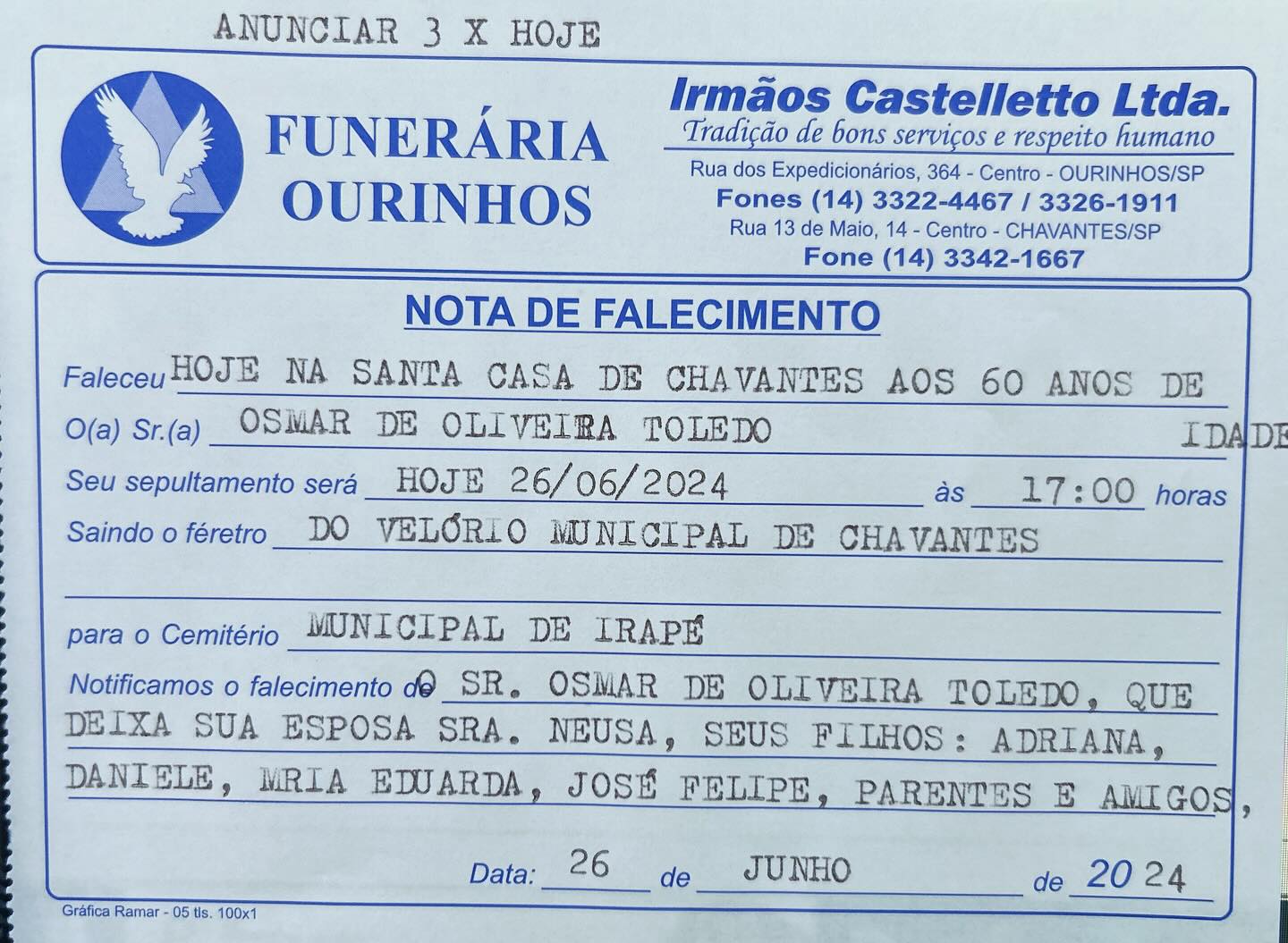 A Funerária Ourinhos informa o falecimento do senhor Osmar de Oliveira Toledo, aos 60 anos. O corpo está sendo velado no Velório Municipal de Chavantes. O sepultamento será realizado hoje, 26 de junho de 2024, às 17h, no cemitério do Distrito de Irapé. Meus sentimentos à família.
