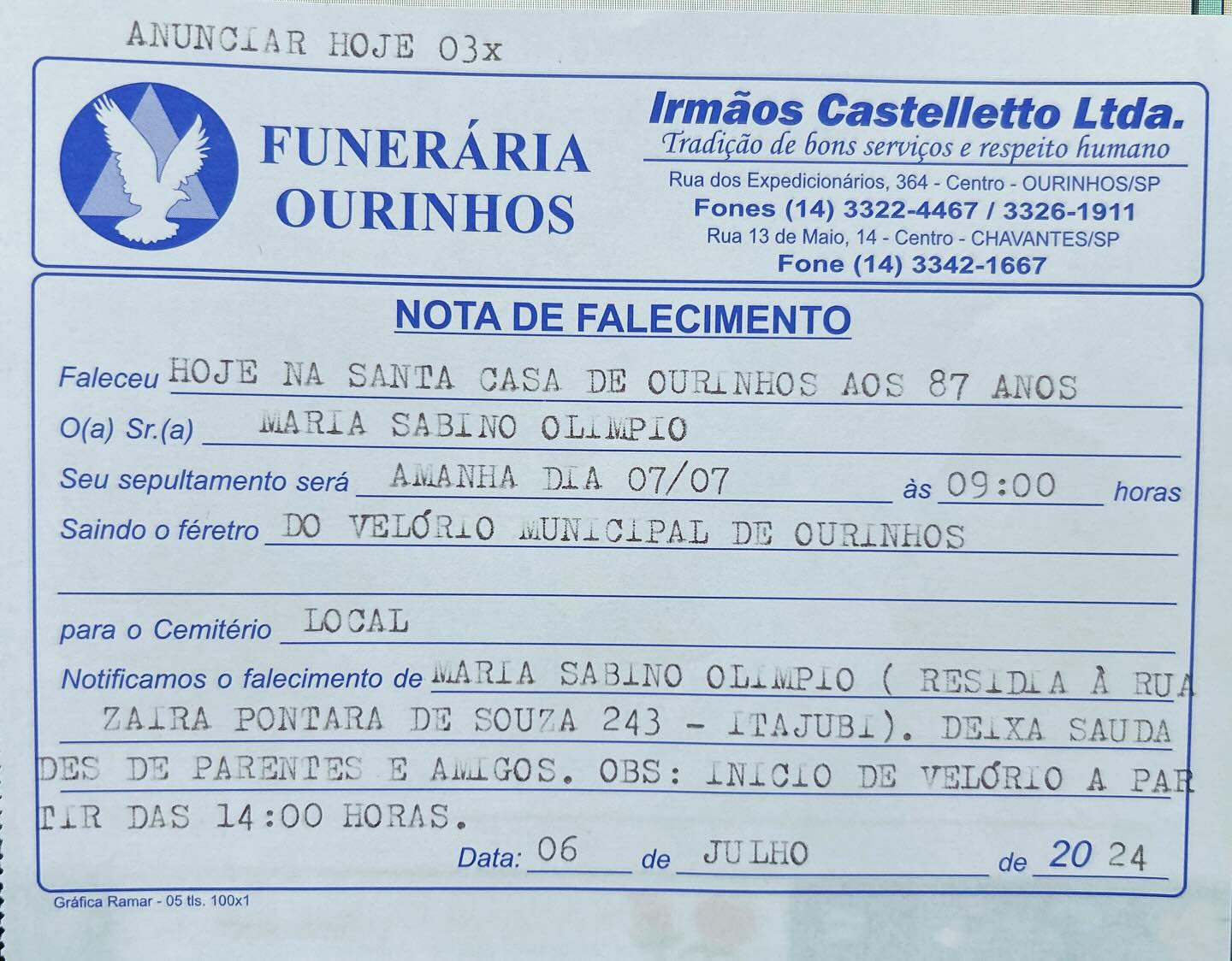 Faleceu em Ourinhos, Maria Sabino Olímpio, aos 87 anos. Seu corpo está sendo velado no Velório Municipal de Ourinhos, e o sepultamento será realizado às 9h deste domingo, 7 de julho, no Cemitério Municipal de Ourinhos.