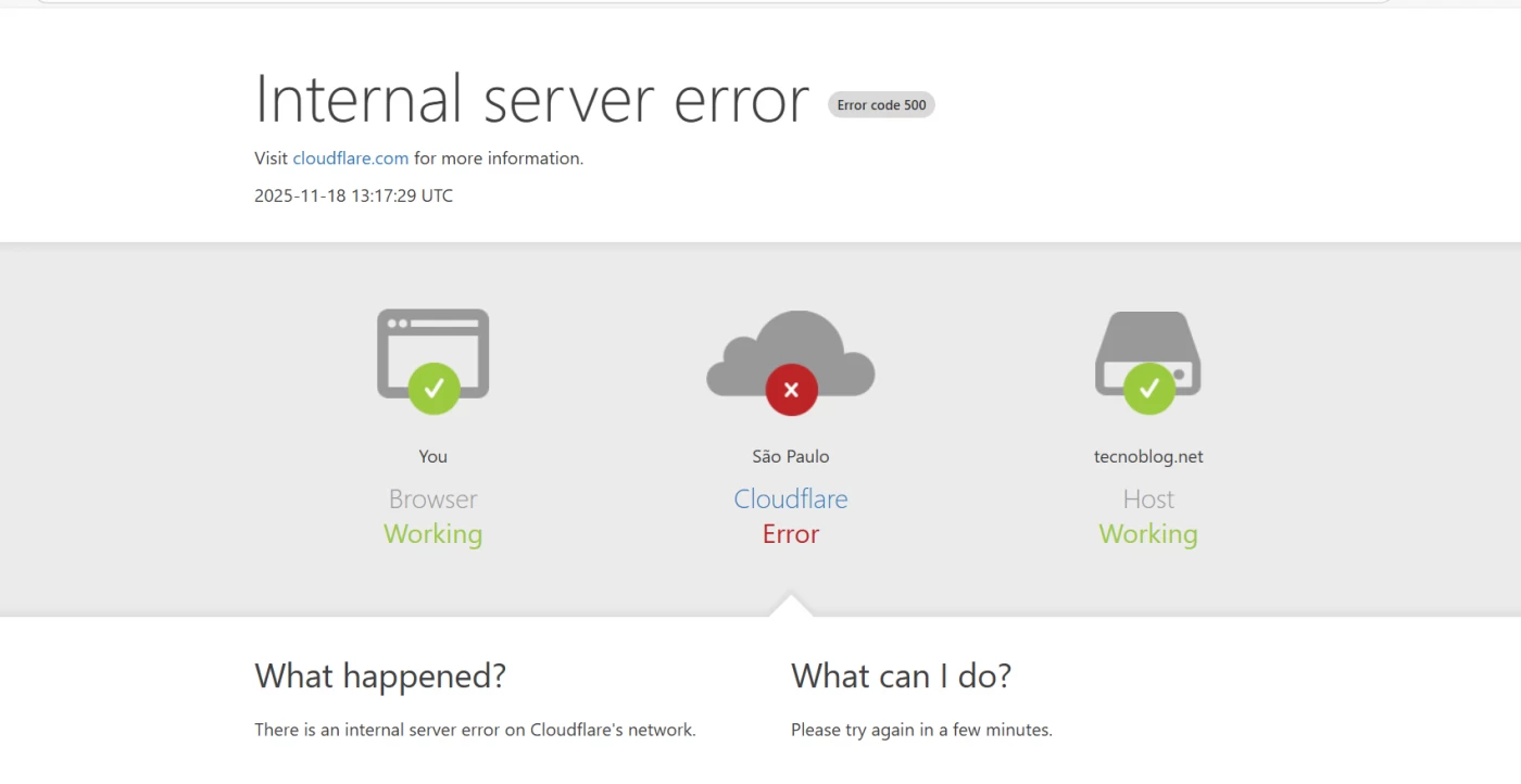Usuários relataram erros do tipo “500 Internal Server Error” ou mensagens pedindo para desbloquear challenges.cloudflare.com para prosseguir, o que indica que o problema não está nos sites em si, mas no “meio de campo”: a Cloudflare, que é usada por muitos desses serviços para proteger e entregar conteúdo. No Reddit, diversos usuários confirmam que a rede global da Cloudflare está enfrentando problemas graves — o painel de status da empresa também mostra que há uma investigação em curso para “degraded performance” nos seus serviços mais críticos.