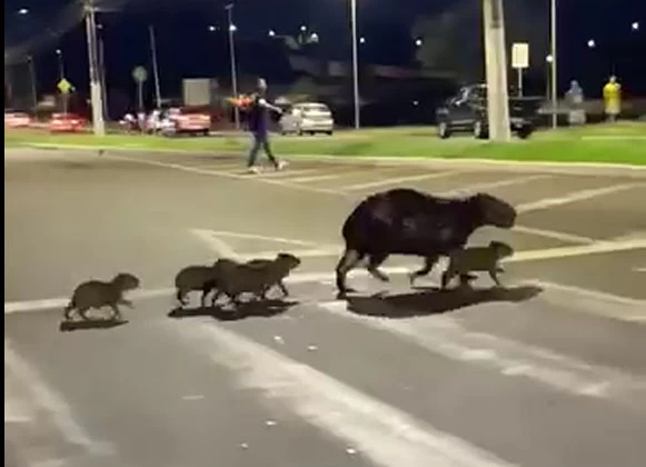 Um vídeo que circulou intensamente nas redes sociais na noite desta sexta-feira (2) chamou a atenção dos moradores de Ourinhos. As imagens mostram duas capivaras adultas atravessando a Avenida Luiz Saldanha Rodrigues, na região do Lago do Royal Park, acompanhadas de cinco filhotes.