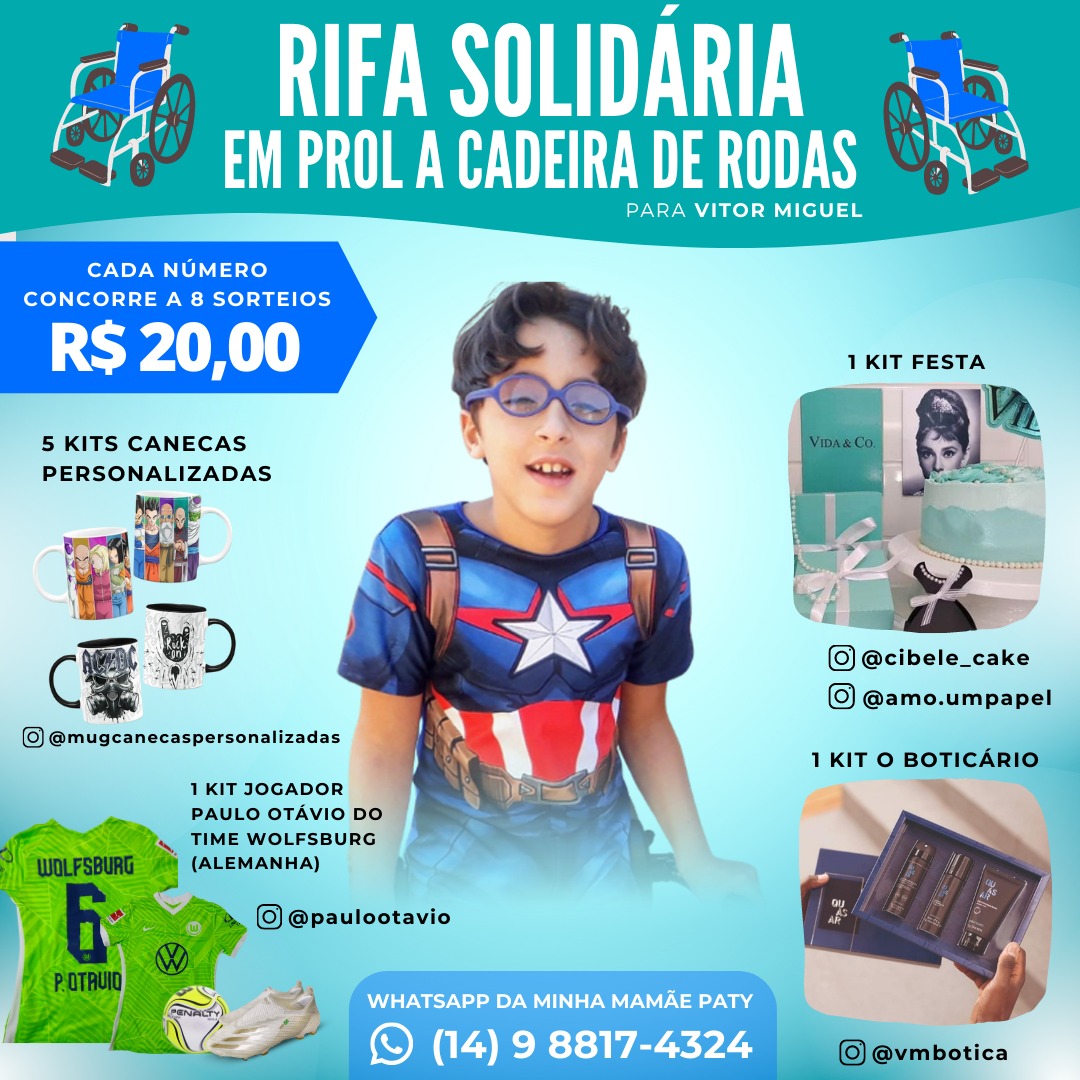 Uma família, que mora na Cohab de Ourinhos, está promovendo uma rifa, afim de arrecadar o valor necessário (cerca de R$4 mil) para comprar uma cadeira de rodas especial para o garoto Vitor Miguel Passos de Andrade “Vitão”, de 9 anos, diagnosticado com paralisia cerebral, autismo e epilepsia.