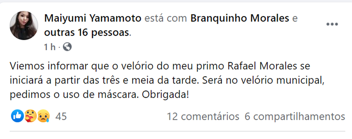 Familiares do vereador de Salto Grande, Rafael Morales, o Branquinho Morales (PSDB), de 31 anos, que sofreu um grave acidente, na entrada da cidade, ao bater no monumento da Santa Nossa Senhora do Patrocínio, no fim da tarde de ontem, 29, informaram que seu corpo será velado a partir das 15h30 de hoje, no velório municipal da cidade. A postagem feita por uma prima nas redes sociais, não informa o horário do sepultamento que deve acontecer já no final da tarde. Ela pede para os presentes usem máscaras de proteção contra o novo coronavírus.