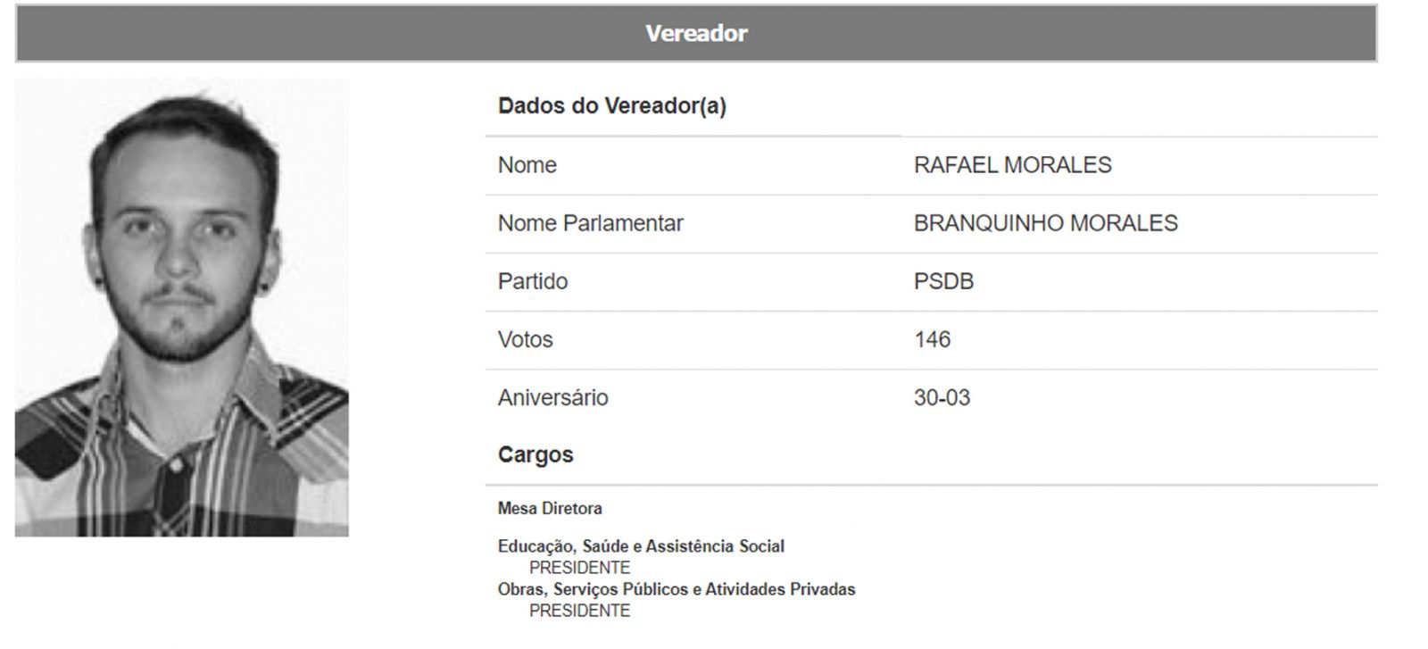 Vereador de dois mandatos, Branquinho Morales era muito conhecido e querido em Salto Grade, onde também atuava como vigilante. Segundo amigos, ele gostava muito da prática esportiva, era comunicativo e tinha um grande futuro pela frente.