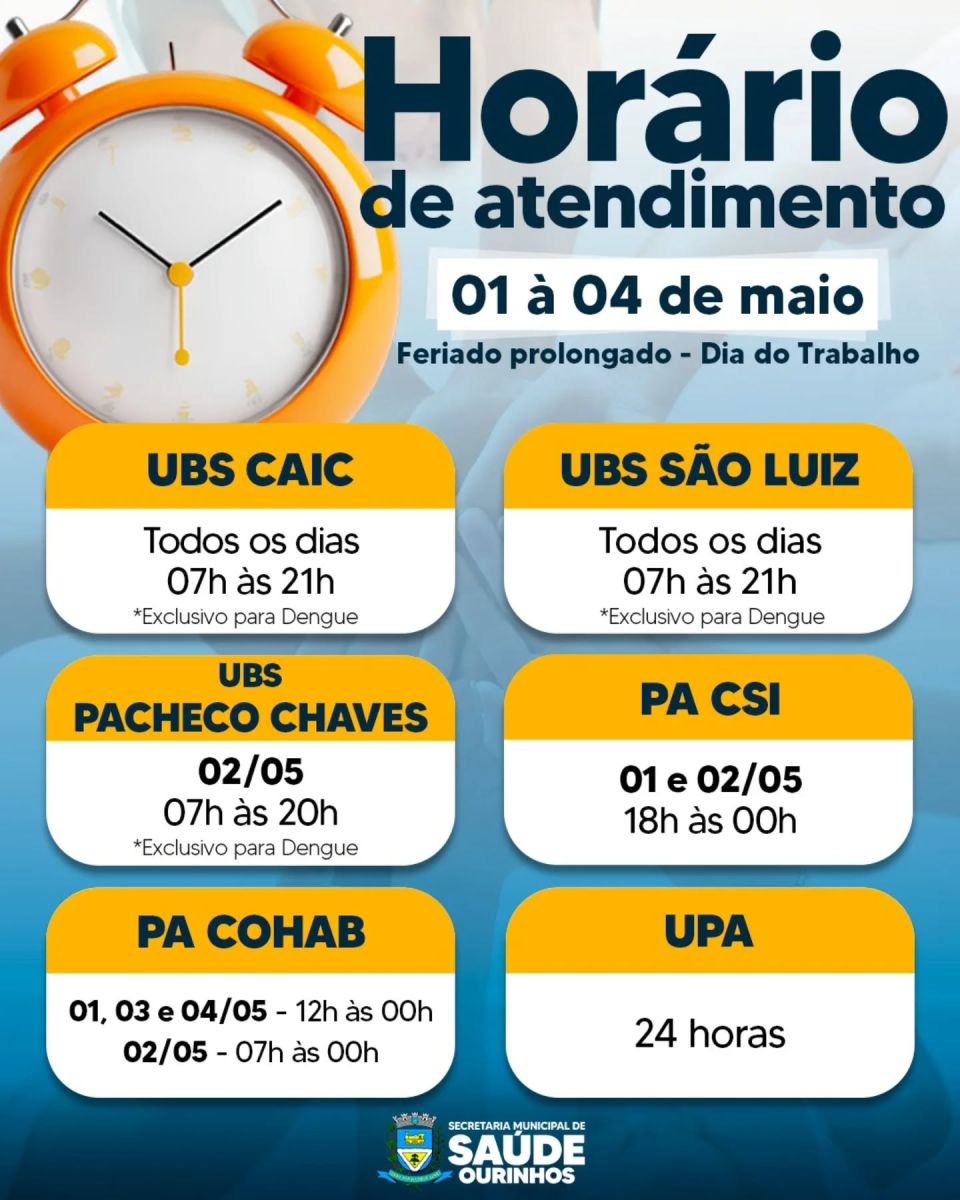 CSI (Postão Central): atenderá casos de urgência e emergência nos dias 01 e 02 de maio, das 18h às 21h. Estará fechado nos dias 03 e 04.