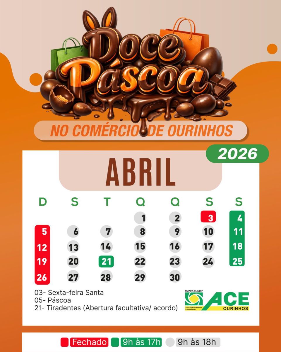 O mês de abril terá horários especiais no comércio de Ourinhos. Na Sexta-feira Santa (dia 3), as lojas estarão fechadas, porém no sábado (dia 4), portas abertas das 9 às 17 horas.