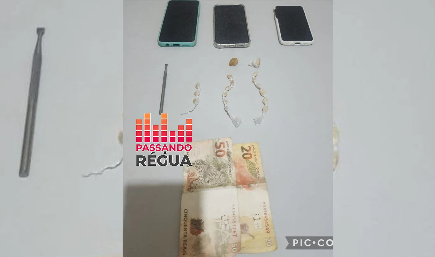 Ao avistarem a aproximação da polícia, os três tentaram escapar a pé. Um deles, identificado como Er... M. N. C. de 18 anos, foi visto arremessando um objeto ao chão. Na abordagem, com ele foram encontrados apenas um celular iPhone e R$ 70 em dinheiro. Já no local onde ele havia dispensado o material, os policiais localizaram duas pedras brutas de crack e uma espátula metálica utilizada para fracionar a droga.