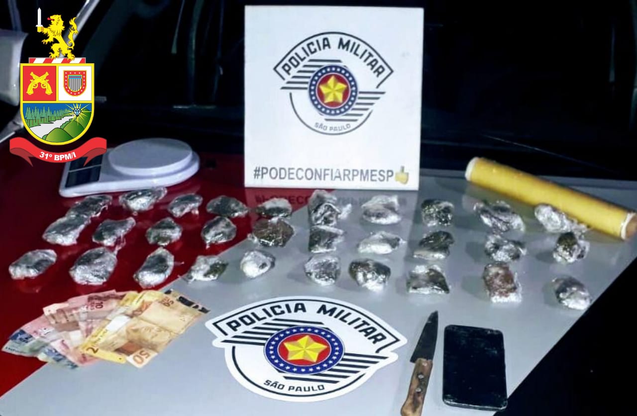 Drogas, dinheiro e faca apreendidos - Imagem : Divulgação- 31º BPMI