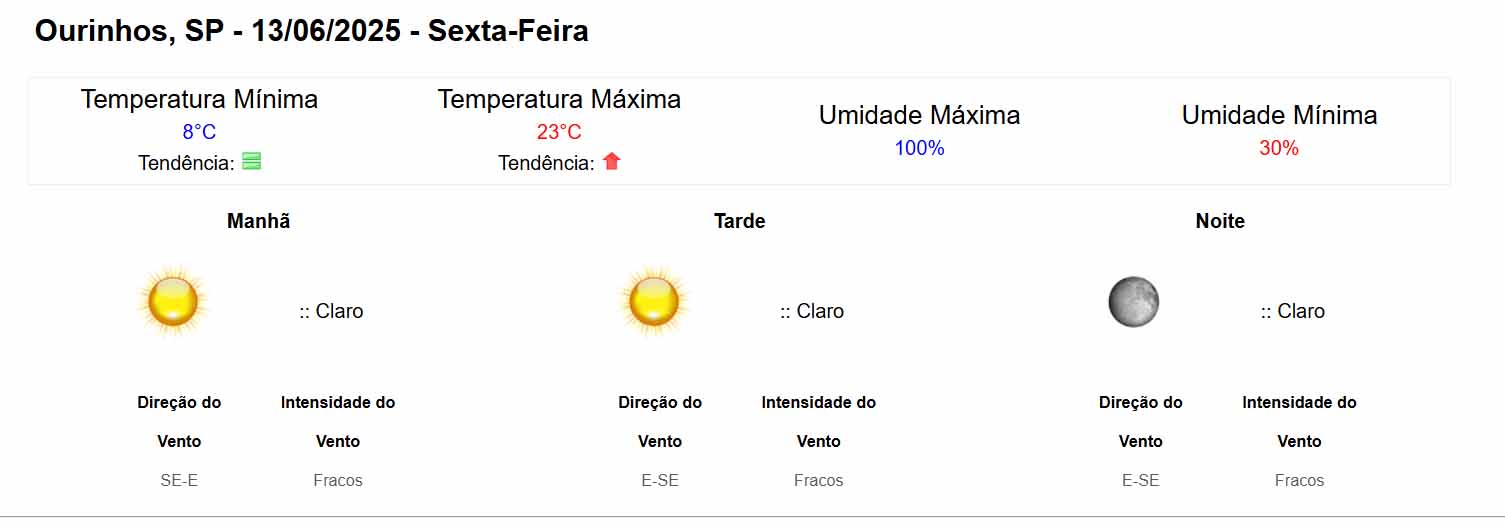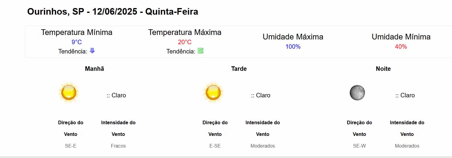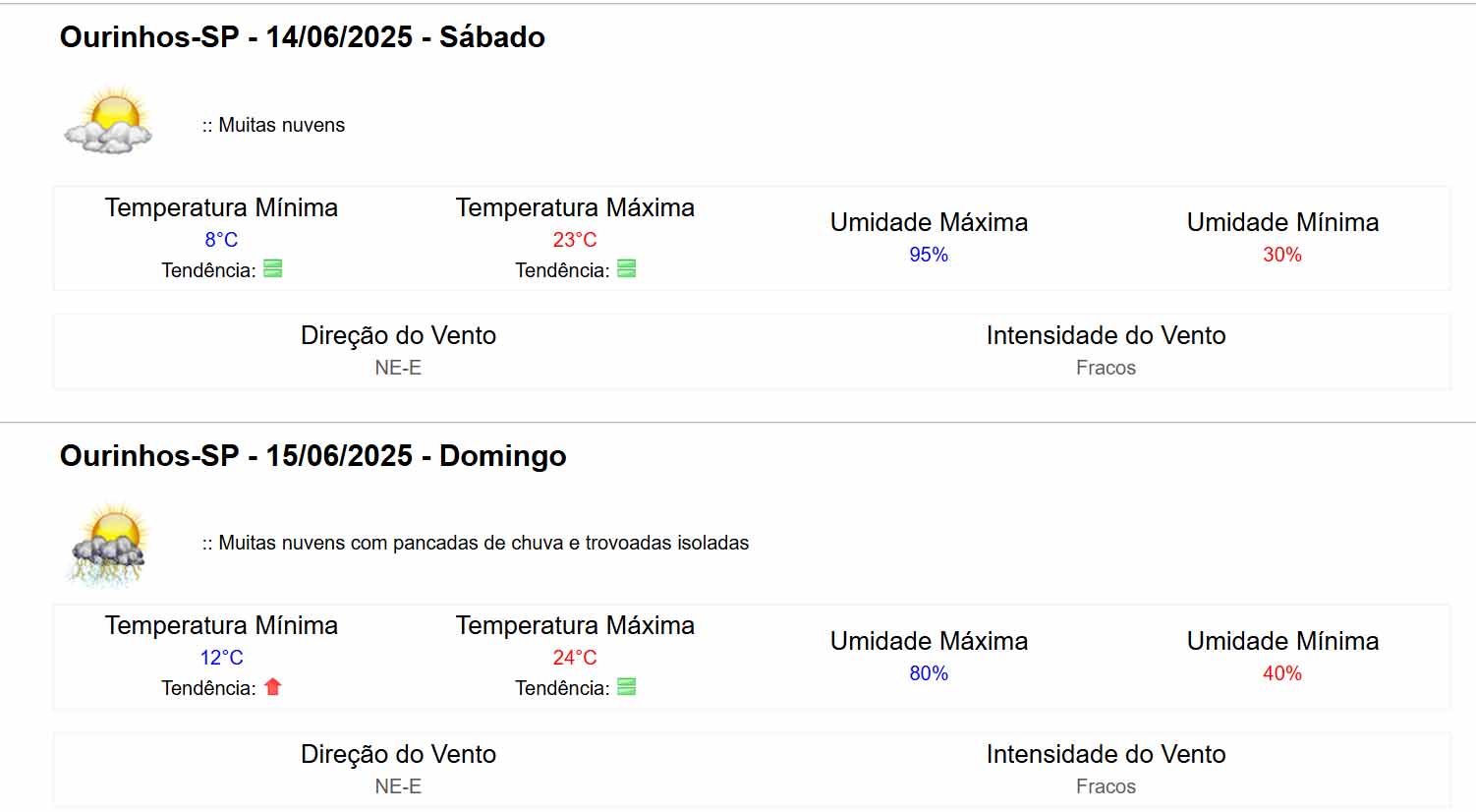 De acordo com o Instituto Nacional de Meteorologia (Inmet), Ourinhos pode registrar mínimas de até 8°C e máximas de 23°C durante os dias da festa. A onda de frio é resultado da segunda frente fria da semana, que avançou pelo oceano na quarta-feira (11) e reforçou o ar polar no Centro-Sul do país.