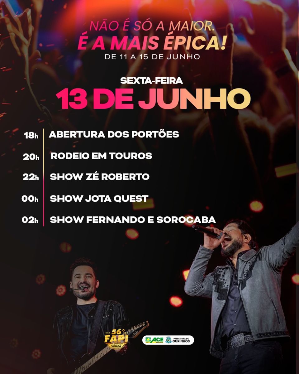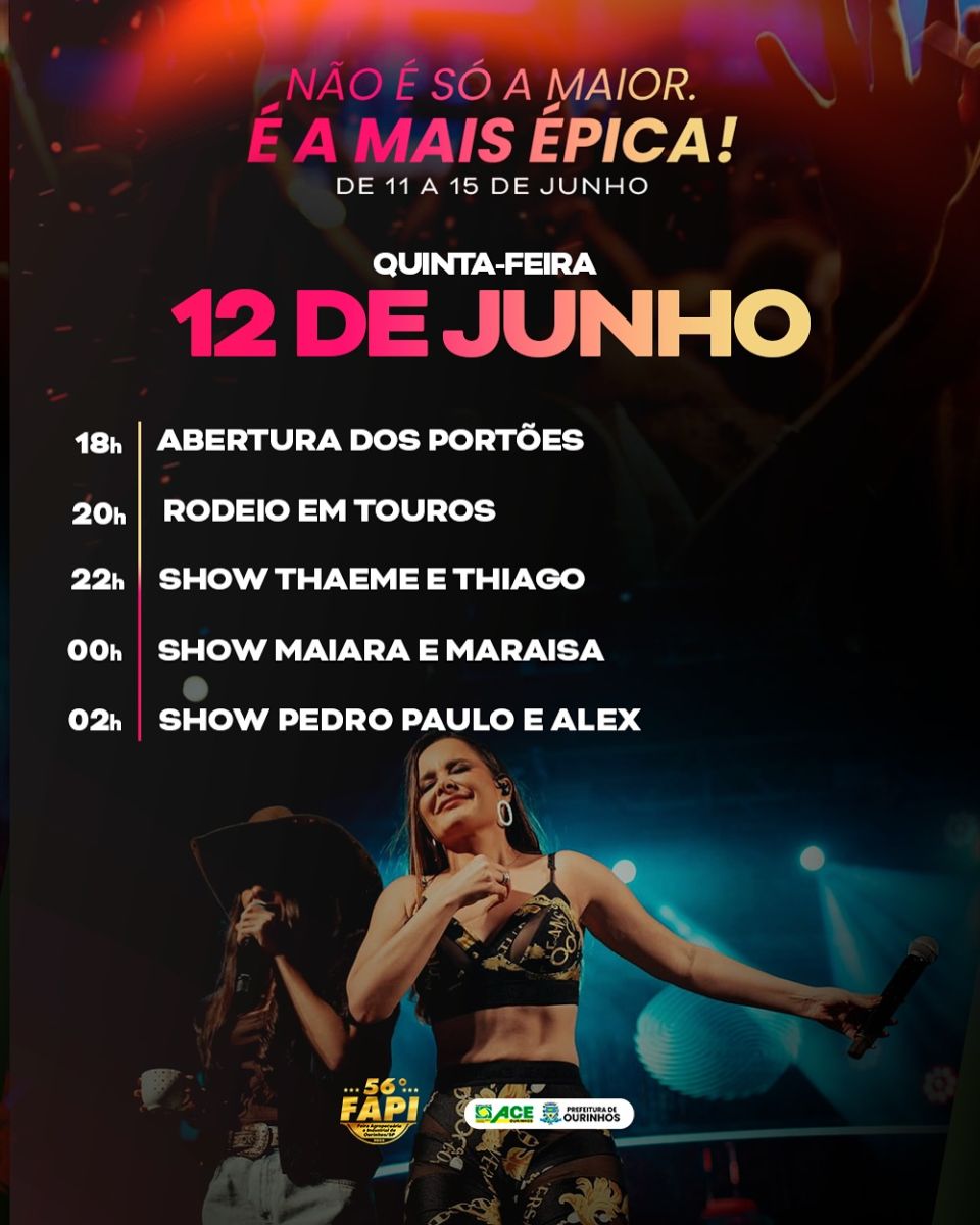 Nesta quinta-feira, 12, as atrações musicais prometem aquecer o público com shows de Thaeme e Thiago, Maiara e Maraisa e Pedro Paulo e Alex, que devem reunir milhares de pessoas, mesmo com o frio previsto para a noite.