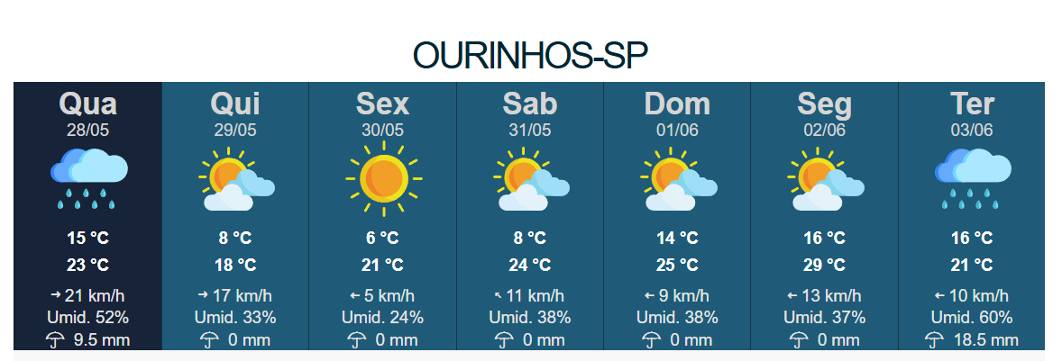 - Quarta-feira (28/5): mínima de 15°C, máxima de 23°C