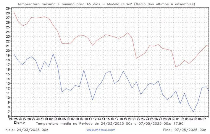 De acordo com os modelos meteorológicos da MetSul, cidades como Bagé (RS), Porto Alegre (RS), General Carneiro (PR), Bauru (SP) e Dourados (MS) sentirão o impacto dessa massa de ar frio. Segundo a meteorologista Estael Sias, os gráficos indicam um declínio nas temperaturas mínimas próximo ao dia 12 de abril e novamente em torno de 4 de maio.