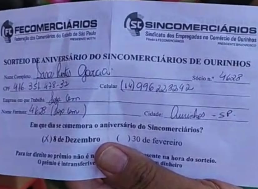 A funcionária das Lojas Cem de Ourinhos, Sara Portes Garcia, moradora no bairro Recanto dos Pássaros em Ourinhos, foi a contemplada no sorteio de Aniversário do Sincomerciários, na tarde desta quarta-feira, 8. O sorteio foi realizado no calçadão da Rua Paraná e transmitido ao vivo pela página do Passando a Régua. (confira o vídeo mais abaixo)